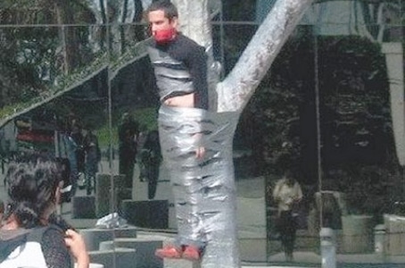 According to witnesses, protesters arrived at the event in a vintage 1960′s era Volkswagen van and began to pelt the gang members with balloons filled with red colored water, simulating blood, and shouting “you’re murderers” to passers by. This, evidently, is when the brouhaha began.