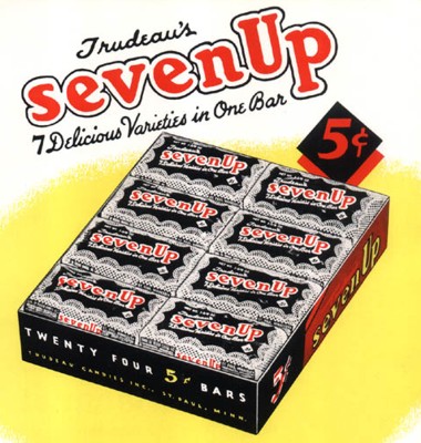 The Seven Up milk chocolate bar featured assorted flavor nougat inside a delicious milk and dark chocolate coating. With cherry, coconut, caramel, fudge, jelly, maple, and Brazil nut centers, it was as if you had a box of chocolates in one handy bar. Technically, the Seven Up bar is still around in the form of the Skybar by Necco.